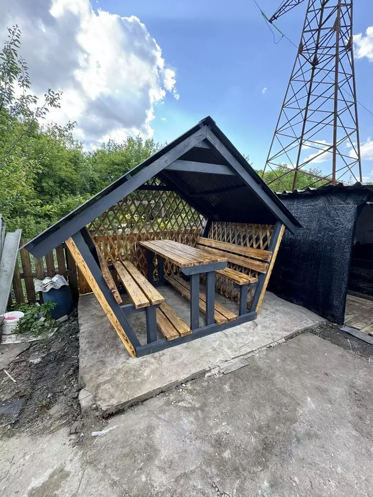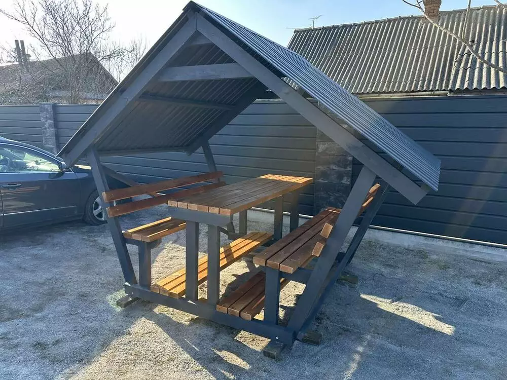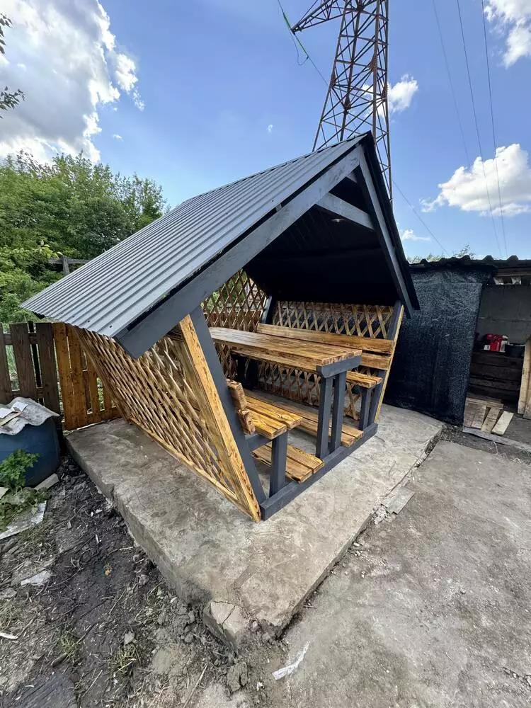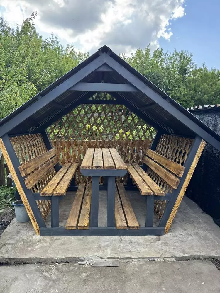 Пропонуємо готову альтанку, як на фото — ідеальне рішення для комфортного відпочинку у дворі, на дачі чи в заміському будинку. Лаконічний дизайн та продумана конструкція роблять її не тільки зручною, а й візуально привабливою.