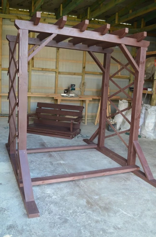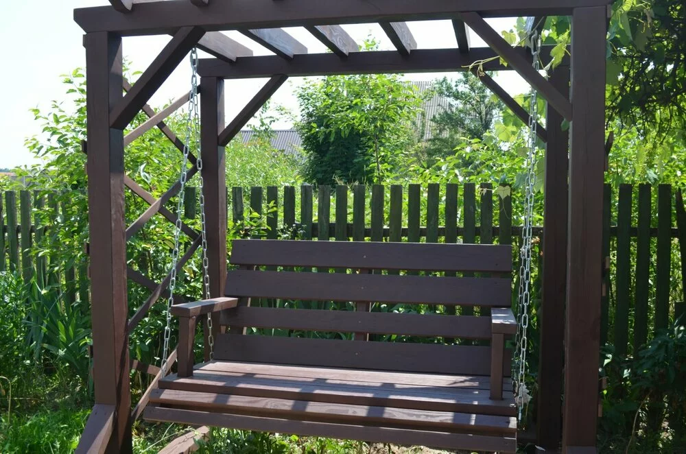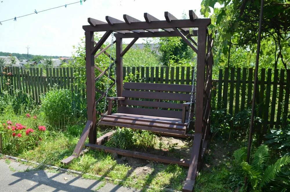Пропонуємо Вам садові гойдалки-перголи. Зазвичай такі гойдалки кріпляться до землі, але в даній моделі додаткова зв'язка ніг і додавання розкосів до стовпів зробили конструкцію надійною та стійкою.