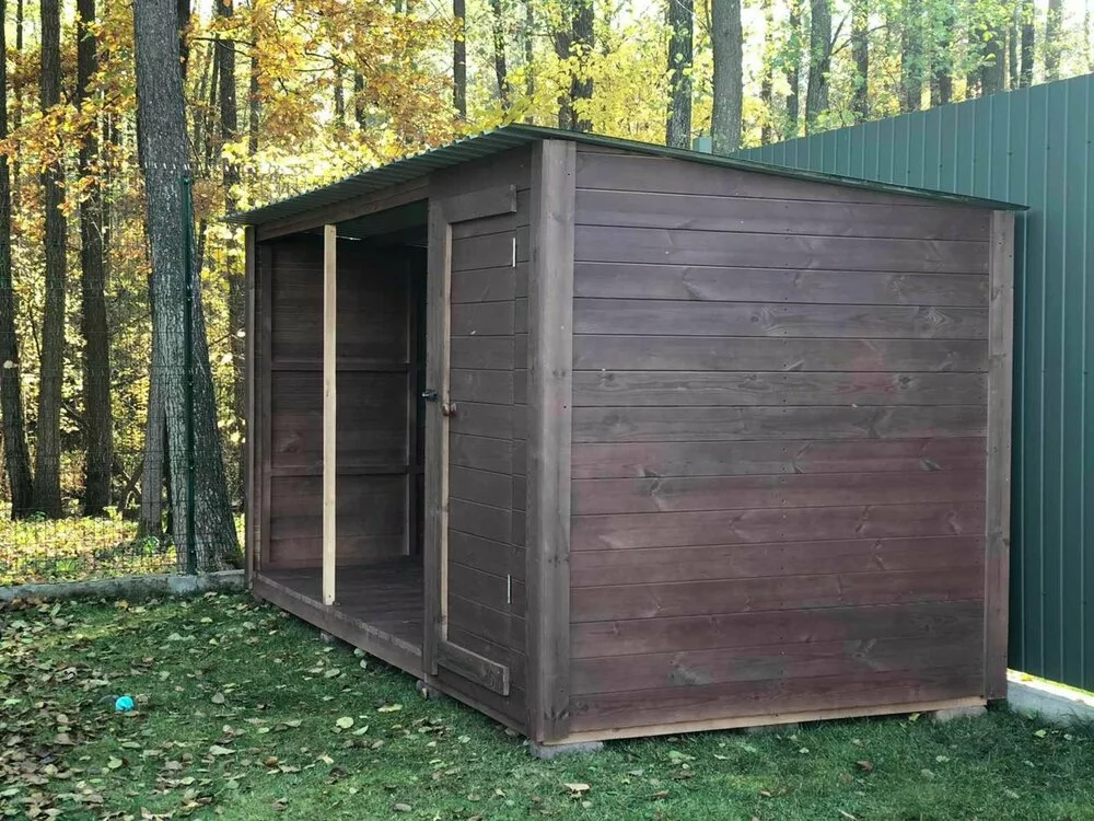 Компанія Karkasstroy займається виготовленням побутівок для дачі та не тільки. Вашій увазі пропонуємо відкриту побутівку з хозблоком. Її можна використовувати для зберігання дров (відкрита частина) та господарського інвентарю.