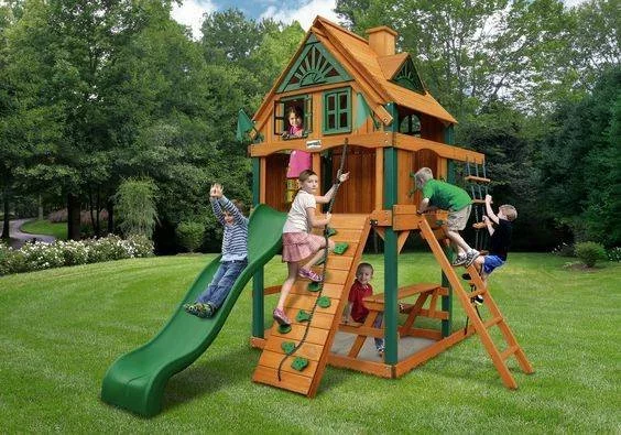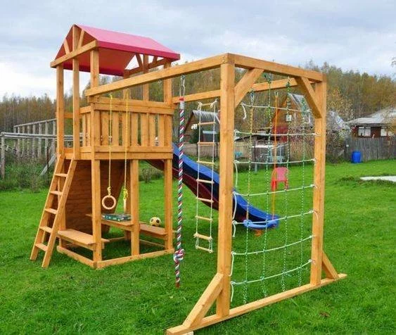 Предлагаем Вашему вниманию игровой комплекс из дерева для детей. Комплекс предназначен для улицы и может быть оборудован домиком, качелями, спусковыми горками, турник, сетками для лазания. У нас Вы можете заказать детские комплексы на любой вкус.